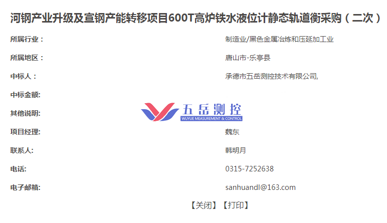 近日,承德市五岳測控技術(shù)有限公司中標(biāo)河鋼產(chǎn)業(yè)升級及宣鋼產(chǎn)能轉(zhuǎn)移項目600T高爐鐵水液位計靜態(tài)軌道衡采購項目。合同臺數(shù)24臺; 項目合同的最終簽訂對整個公司以后業(yè)務(wù)推廣、拓寬市場具有重要的意義,不僅展示了公司的實力同時也展示了公司的核心競爭力。在此,我們對為該項目